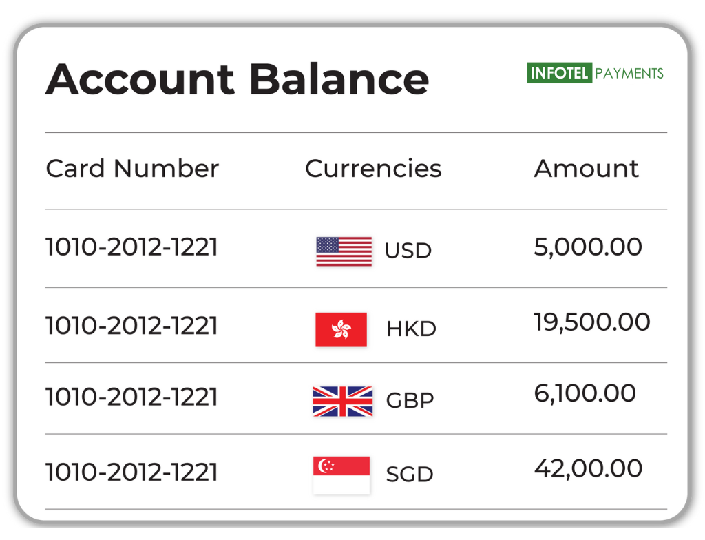 Add money to your Global Account using your bank account. Utilize Infotel Payments for currency conversions with competitive FX rates