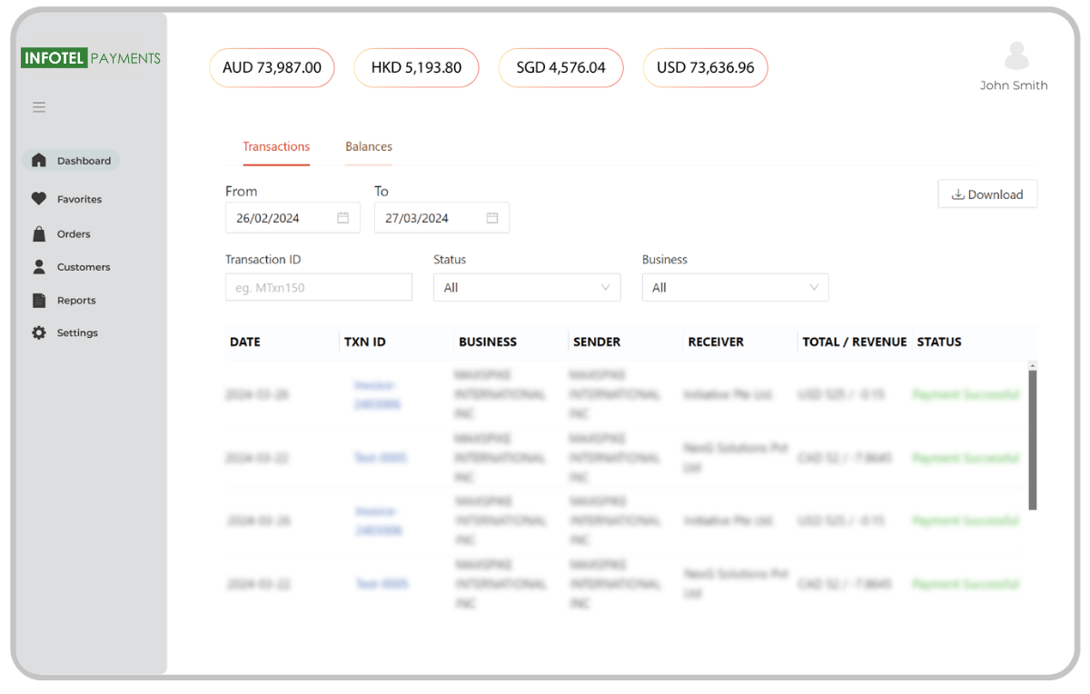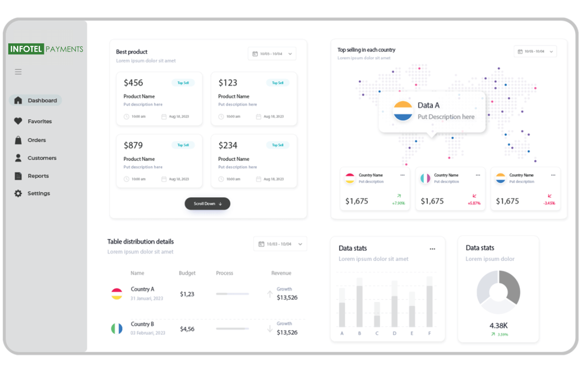 With the Infotel Payments Platform, you’ll get comprehensive insight into all your payment operations. Access detailed information on wallet currencies, account balances, sender and recipient bank details, as well as transaction specifics at the recipient level. Mangage your global financial activities with ease using Infotel Payment’s advanced features.